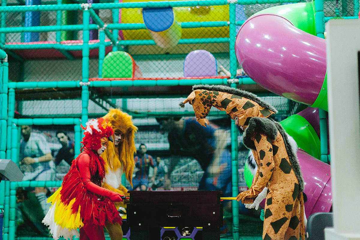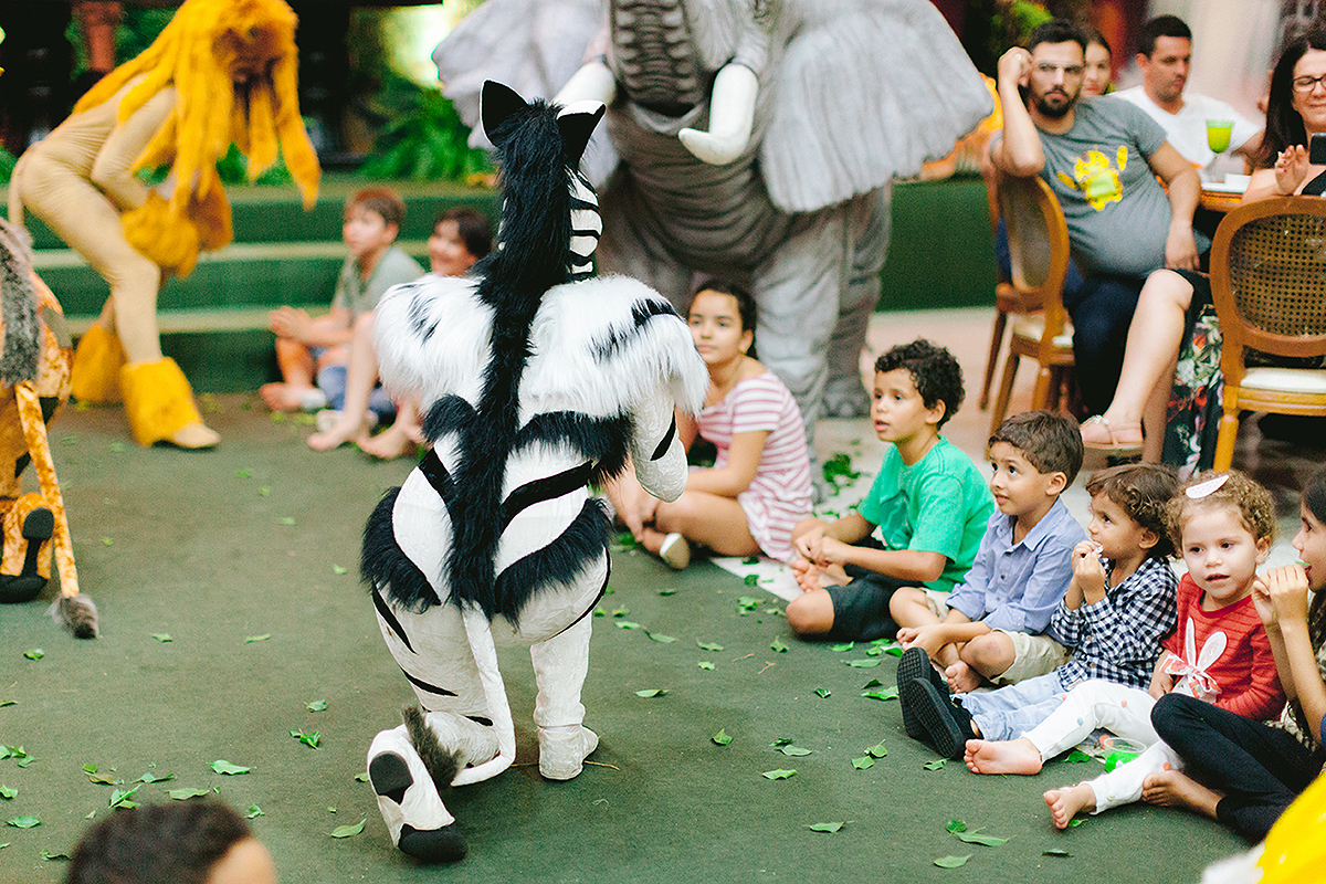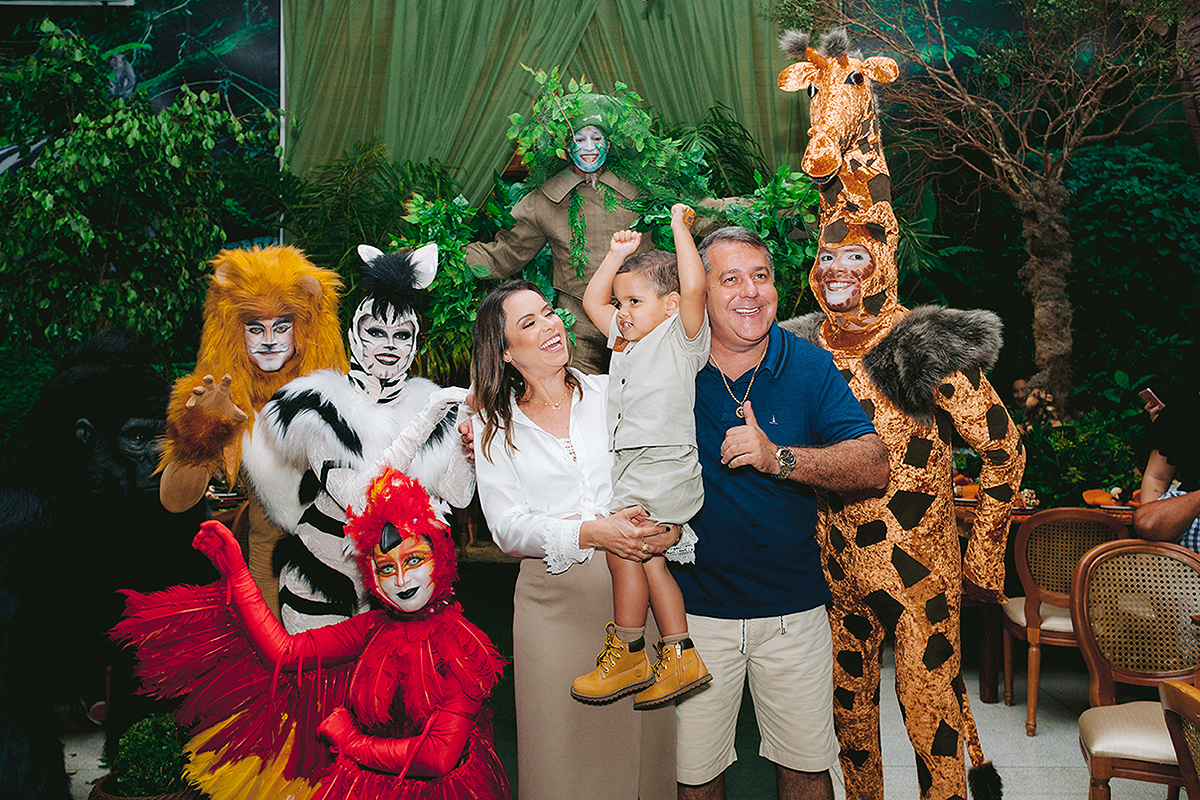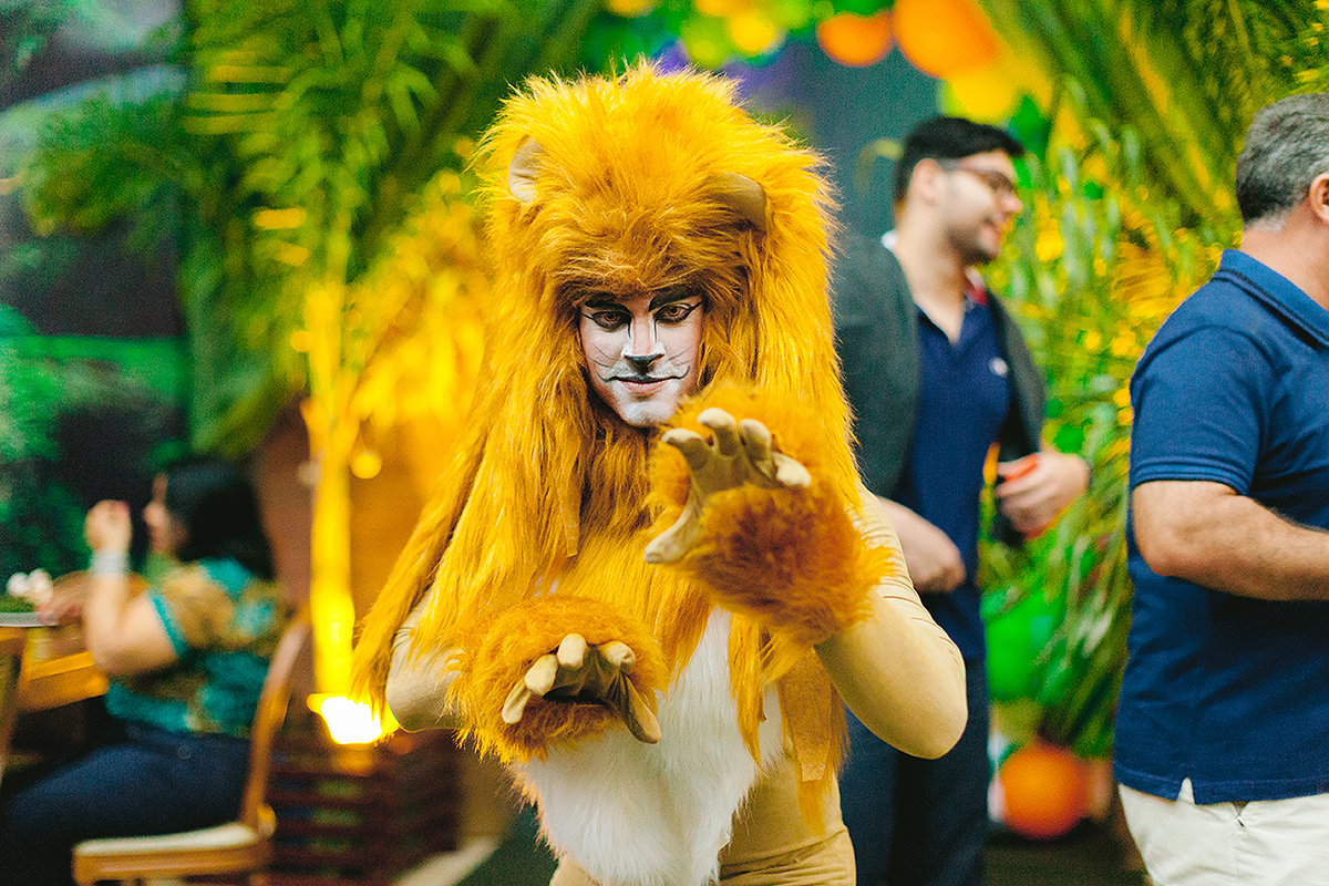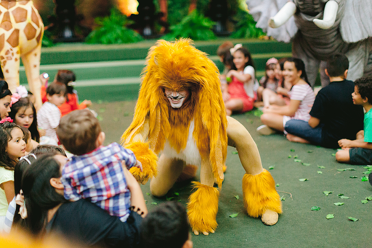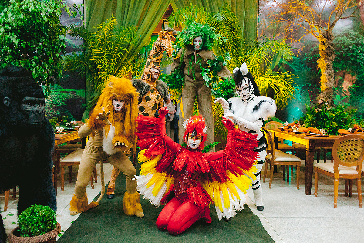 Atores vestidos de animais animaram a festa e foram grandes atrações, todo mundo queria uma foto com eles.