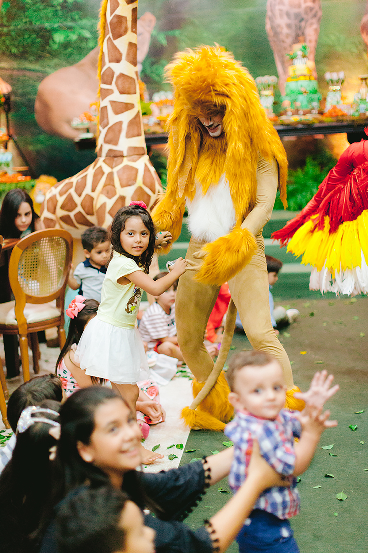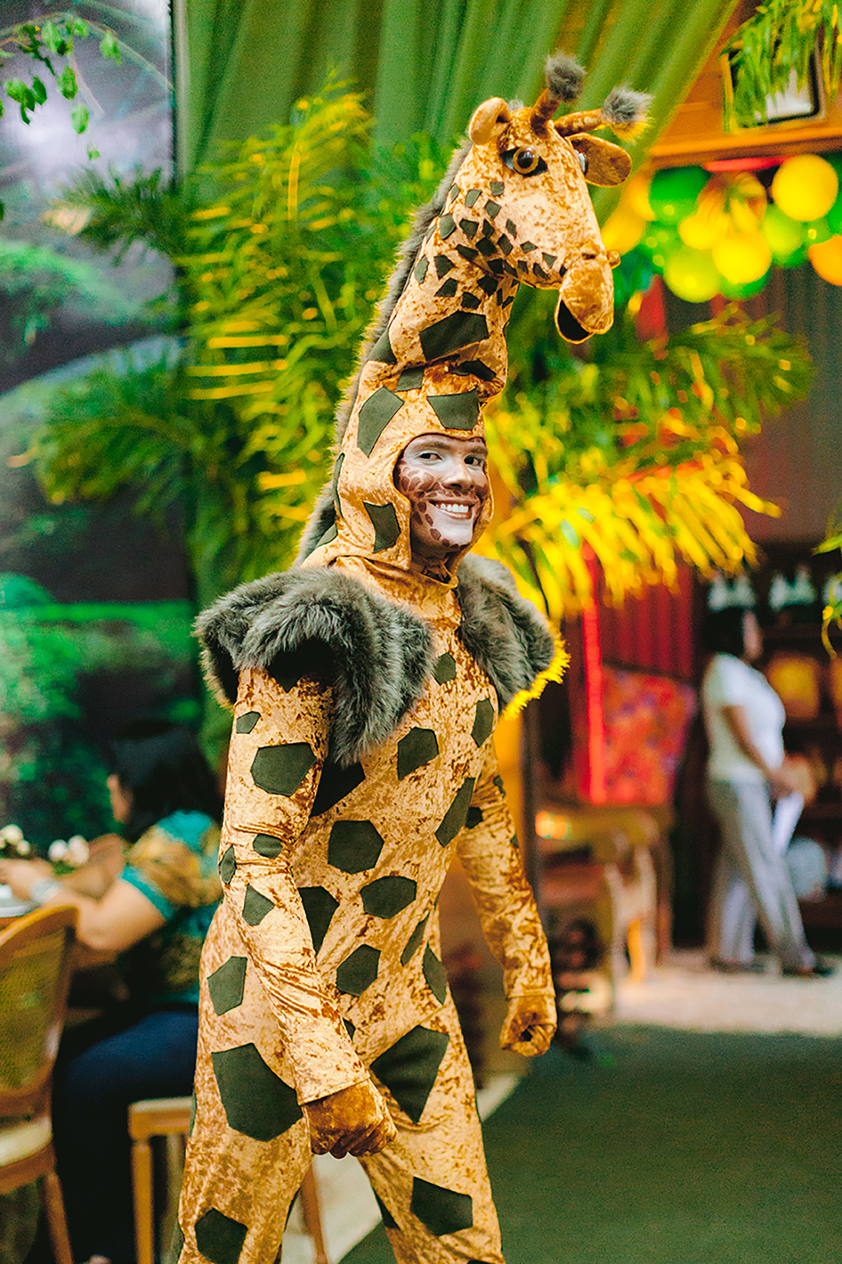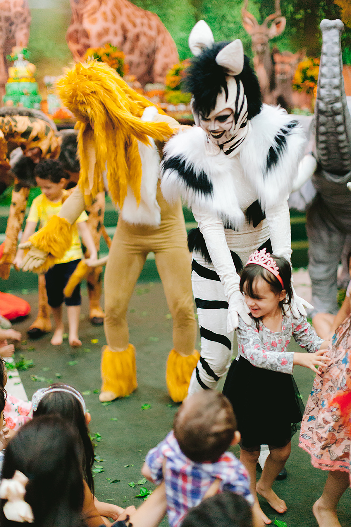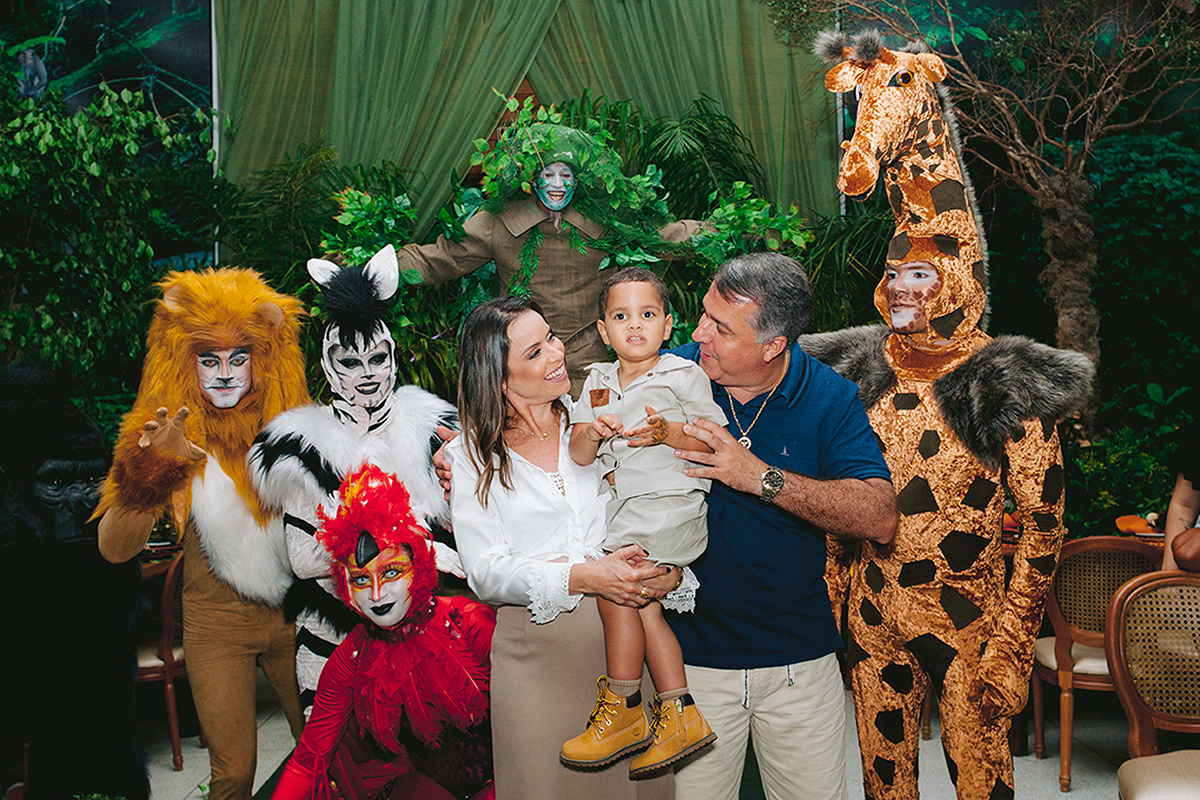 Atores vestidos de animais animaram a festa e foram grandes atrações, todo mundo queria uma foto com eles.